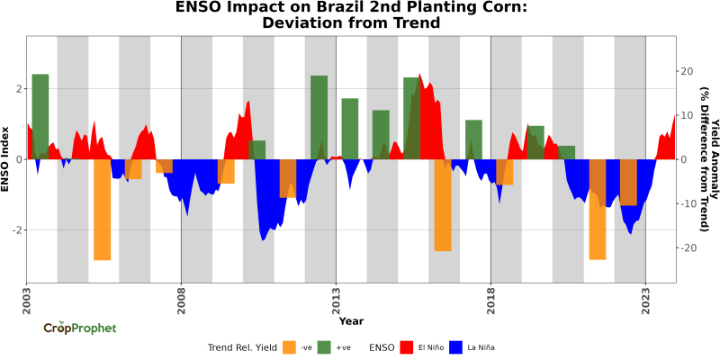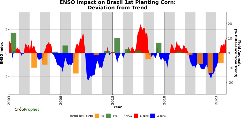 Given the La Niña impacts on Brazil’s climate, we might expect a significant impact of La Niña on the first planting of corn yield. The graphic below shows the La Niña cycles and the corresponding first planting corn yield relative to the expected estimated corn trend yield.