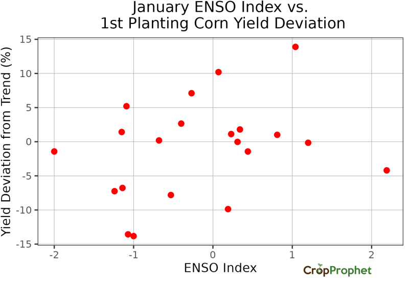 Unlike in our analysis of the impact of La Niña on Argentine crops, the ENSO Cycle/corn yield graphic does not reveal an obvious relationship. Diving deeper, we create a scatter diagram of the relationship between the ENSO index in January and the first planting corn yield deviation, shown below. Again, no strong relationship jumps off the page.