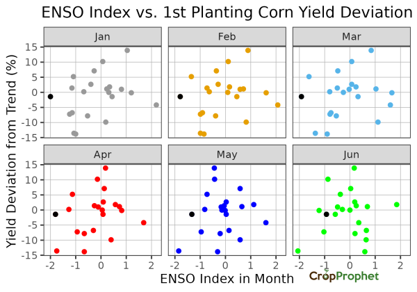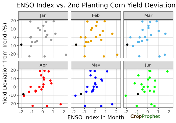 The 2011 La Niña events are highlighted as the black dot in the monthly ENSO index vs. the second planting corn yield deviation map below. As the months progress the relationship does not strengthen. In fact, by June there is no relationship between the ENSO index and corn yield deviations.