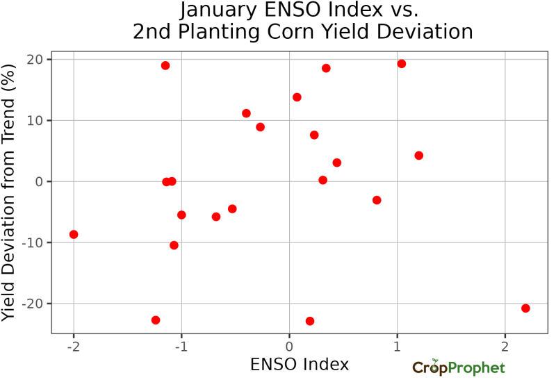In 2011 there was a strong La Niña. The graphic below shows the ENSO index in each month compared to the end-of-season corn yield deviation. Because the first-season corn yield deviation in 2011 was close to normal, even one of the strongest La Niña in recent decades apparently did not have much impact on the first planting yield that year.