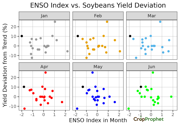 The inverse relationship strengthens as the season progresses. Although ENSO tends to be strongest in January, the climate impacts last through the first half of the year and impact Soybean production.