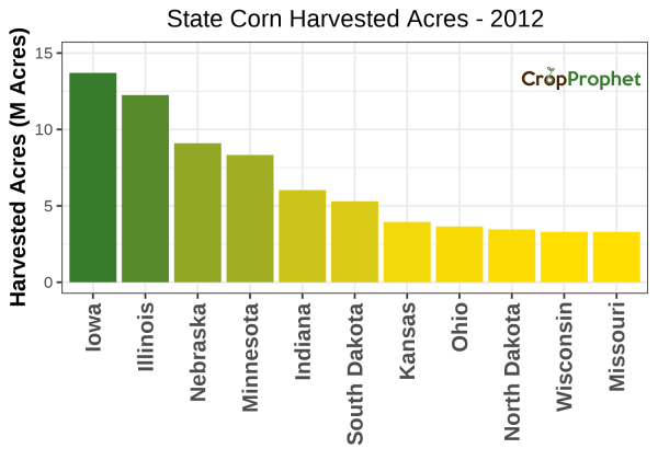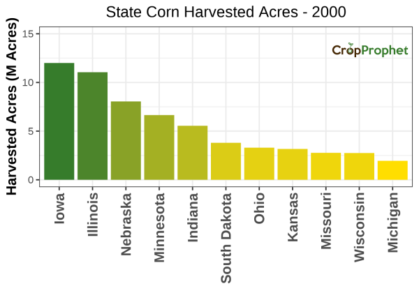 The information below documents the number of corn acres harvested in each state from 2019 to 2000. This information is an important factor in determining annual corn production in each state. The total US corn harvested acres (and corn planted acres) by year are shown below. This type of information is used by CropProphet, a corn, soybean, and winter wheat yield and production forecasting system. Our weather-based model updates daily and is designed for agriculture futures market participants. Risk-free trials are available.
