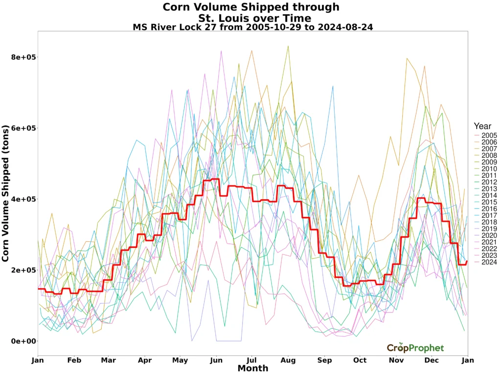 An insightful article from the AgWeb Farm Journal highlights a critical logistical challenge in soybean transport via the Mississippi River, as explained by Mike Steenhoek. Steenhoek observes, “Every foot of reduced water depth or draft equates to loading 7,000 fewer bushels of soybeans on an individual barge.” He further explains, “Overall reductions range from 10% to 15% on the modest end, reaching as much as 30% to 40%, which is a substantial impact.” At CropProphet, we endeavor to provide objective weather-based grain market information based on available data. Mr. Steenhoek’s quote motivated us to verify these striking figures to understand the impact of precipitation on grain shipment volumes. So, we examine available data to uncover the broader implications of fluctuating river levels on agricultural transport.