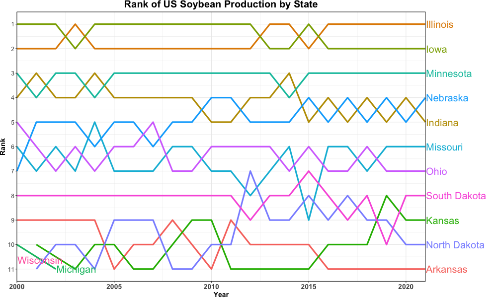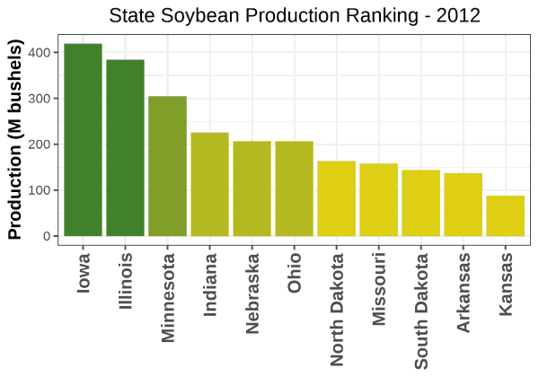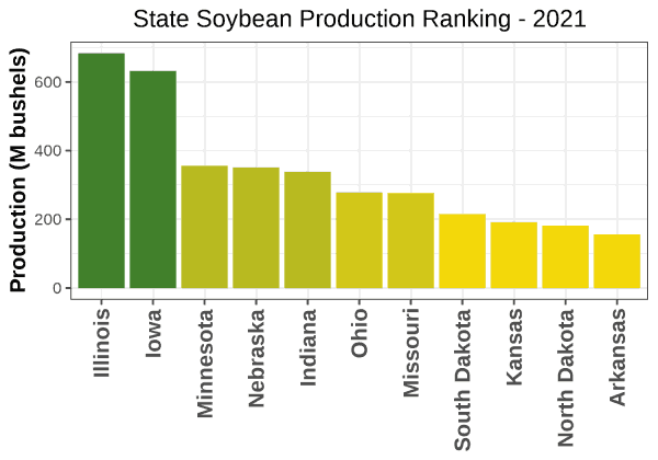 In this post, we review the top rankings of soybean production by state, a statistic closely followed by grain traders. An overview of US crop production statistics is also available.