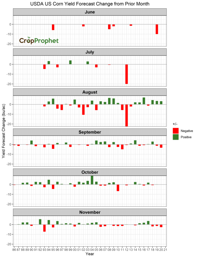 For example, the USDA rarely changes its yield estimate from May to June. However, the graphic also indicates that August corn yield updates almost always change relative to July, even by a small amount.