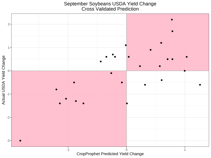 A simple cross-validated CropProphet-based model correctly predicts the direction of the USDA September Soybean yield forecast changes 67% of the time. The same model also predicts the USDA August corn yield forecast direction changes 73% of the time. These results are summarized in the table below. The other months are not shown here.