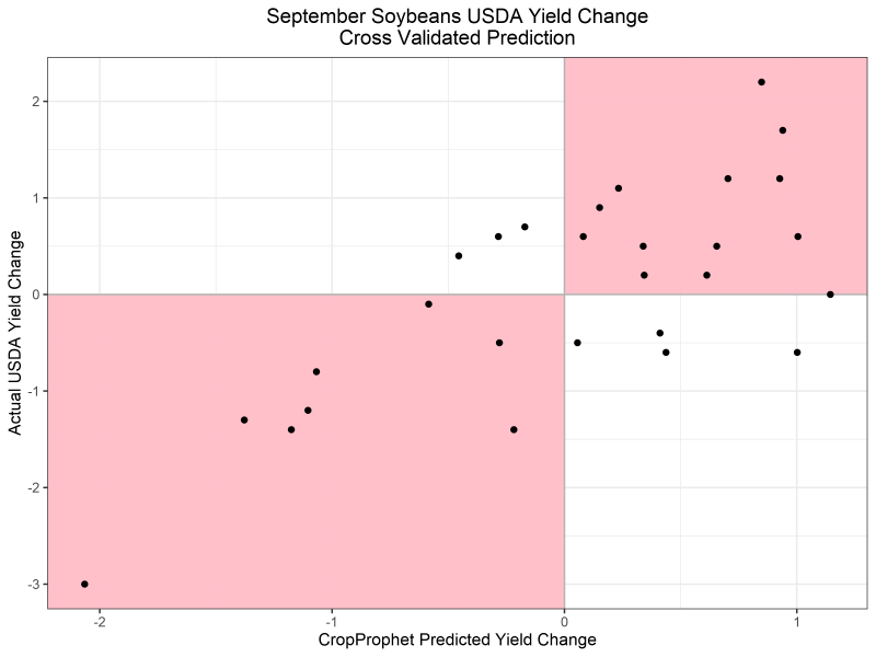 The graph below compares the CropProphet September Soybeans yield forecast change prediction vs. the actual USDA yield forecast change. The graph regions colored pink are years when the CropProphet prediction and the actual USDA yield forecast changed in the same direction.